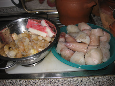Adicione 2 colheres de sopa de creme de marisco, (seguir instruções da embalagem) um ramo de coentros frescos, sirva de imediato e..........